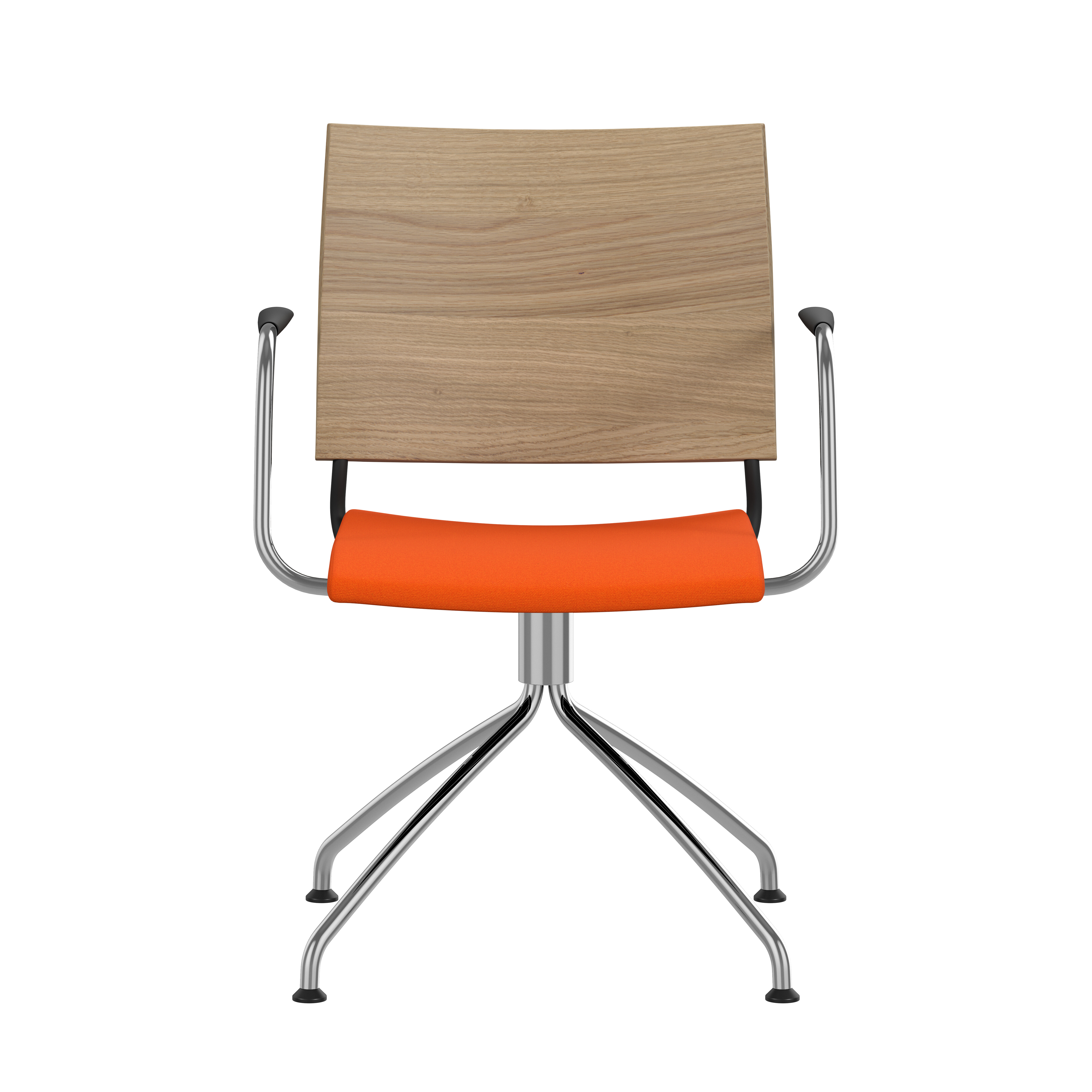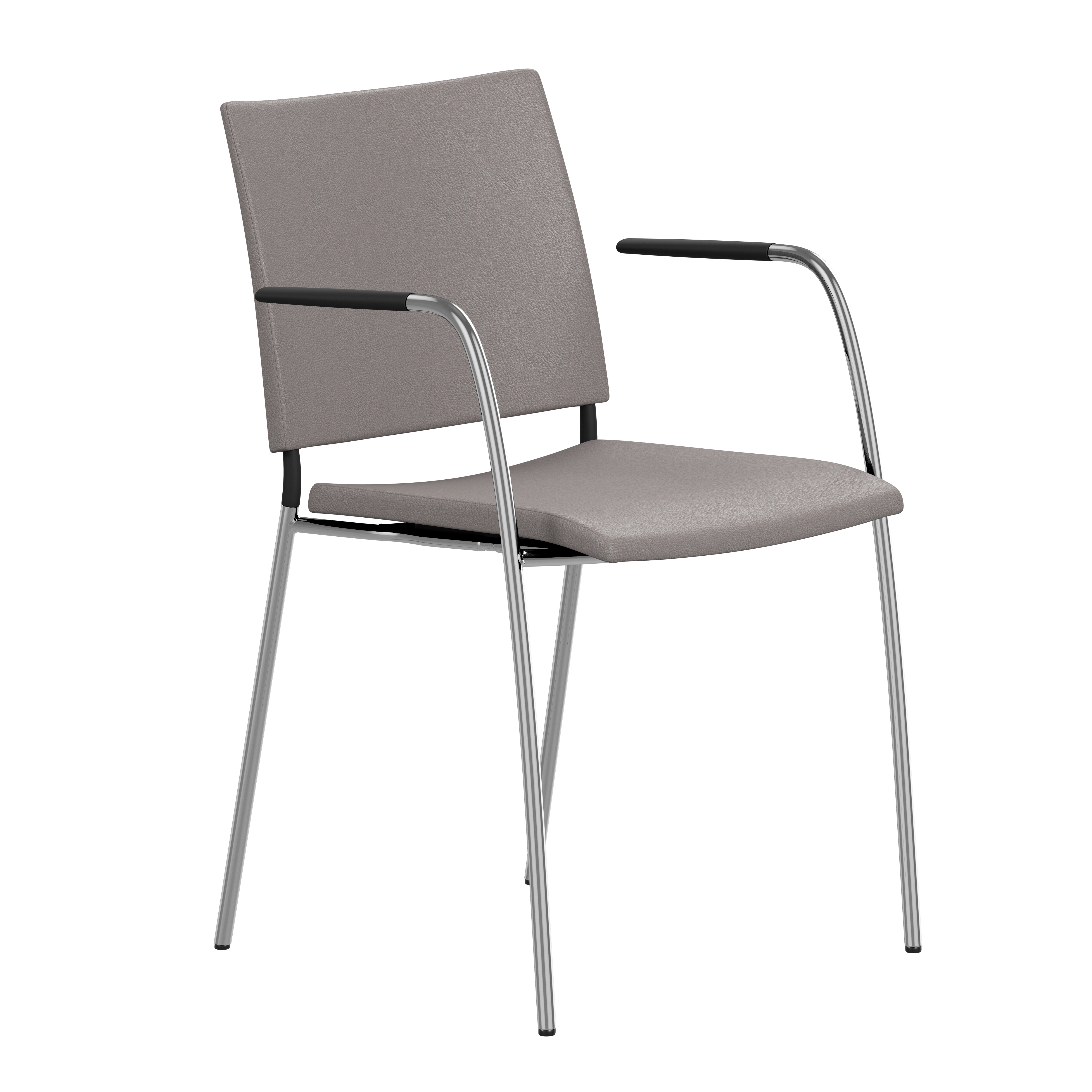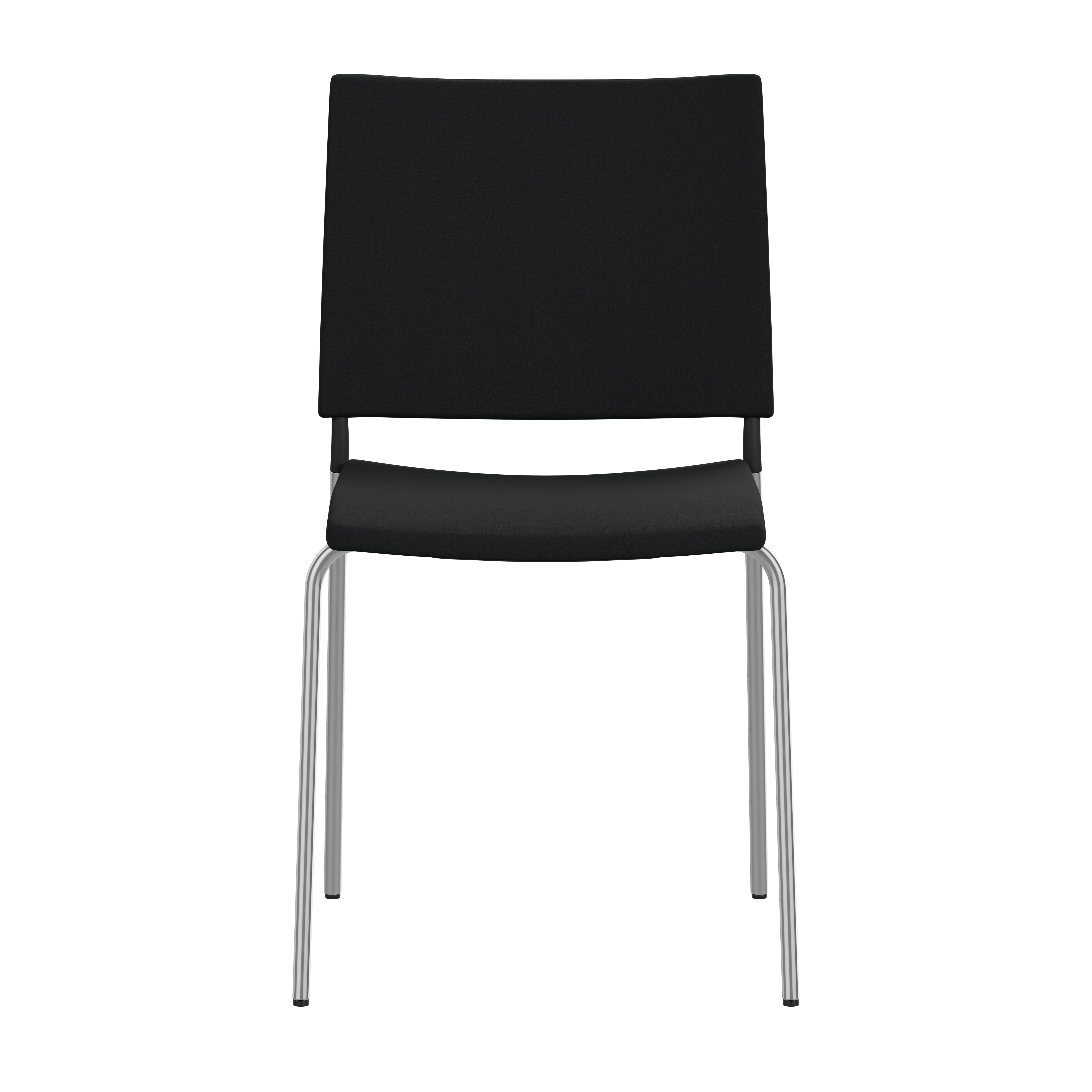 Frame of Ø18 mm powder coated or chromium plated steel tubing. Upholstered seat with high resilient polyurethane foam incl. stacking protection or seat of black cast polyurethane. Upholstered back, black cast polyurethane back or back of natural ash, birch or oak. Alt. stained birch as standard, stained ash on request. Spring steel in back. Armrests in dark or light woodfibre. Note! Armrest contains 40% woodfibre, therefore look may vary.