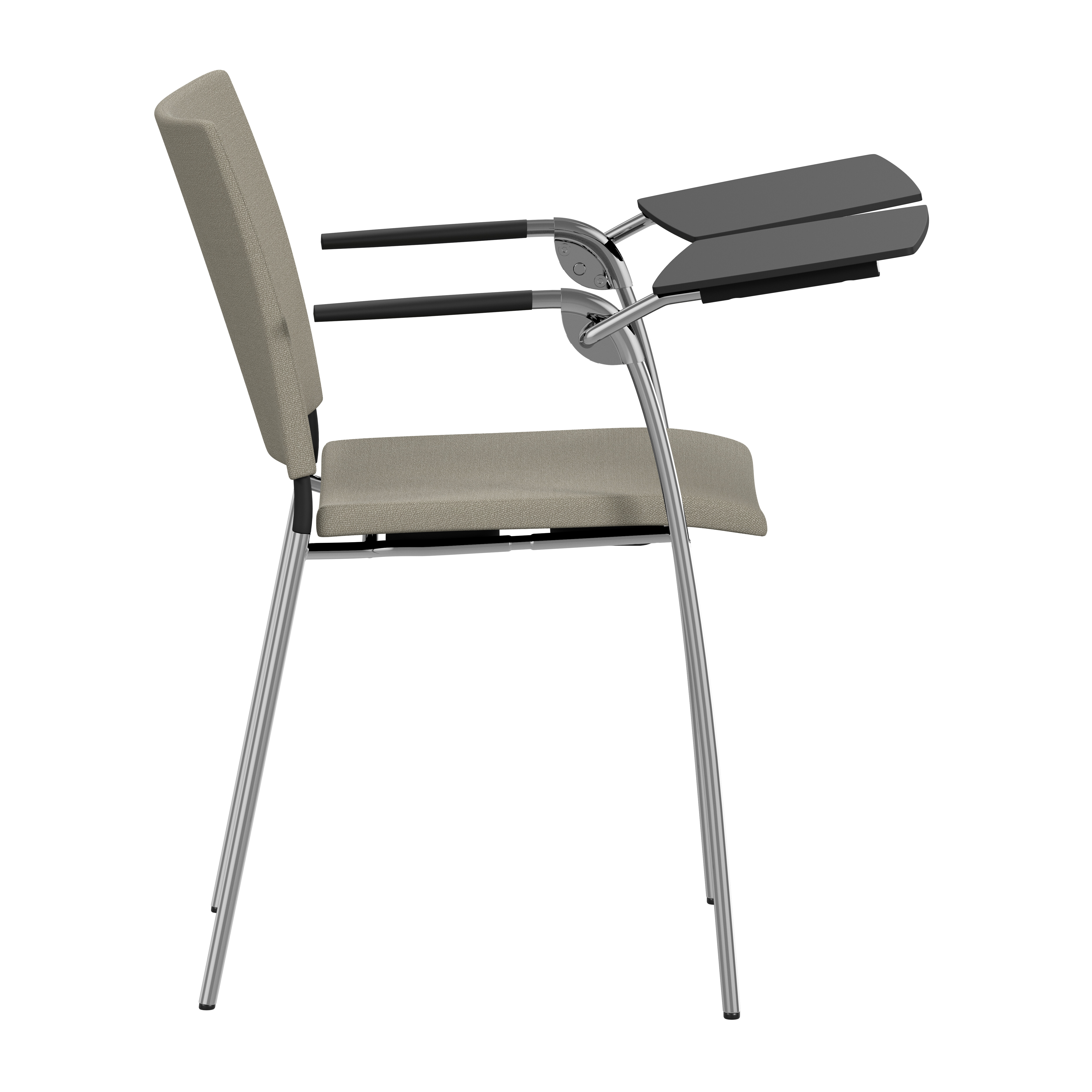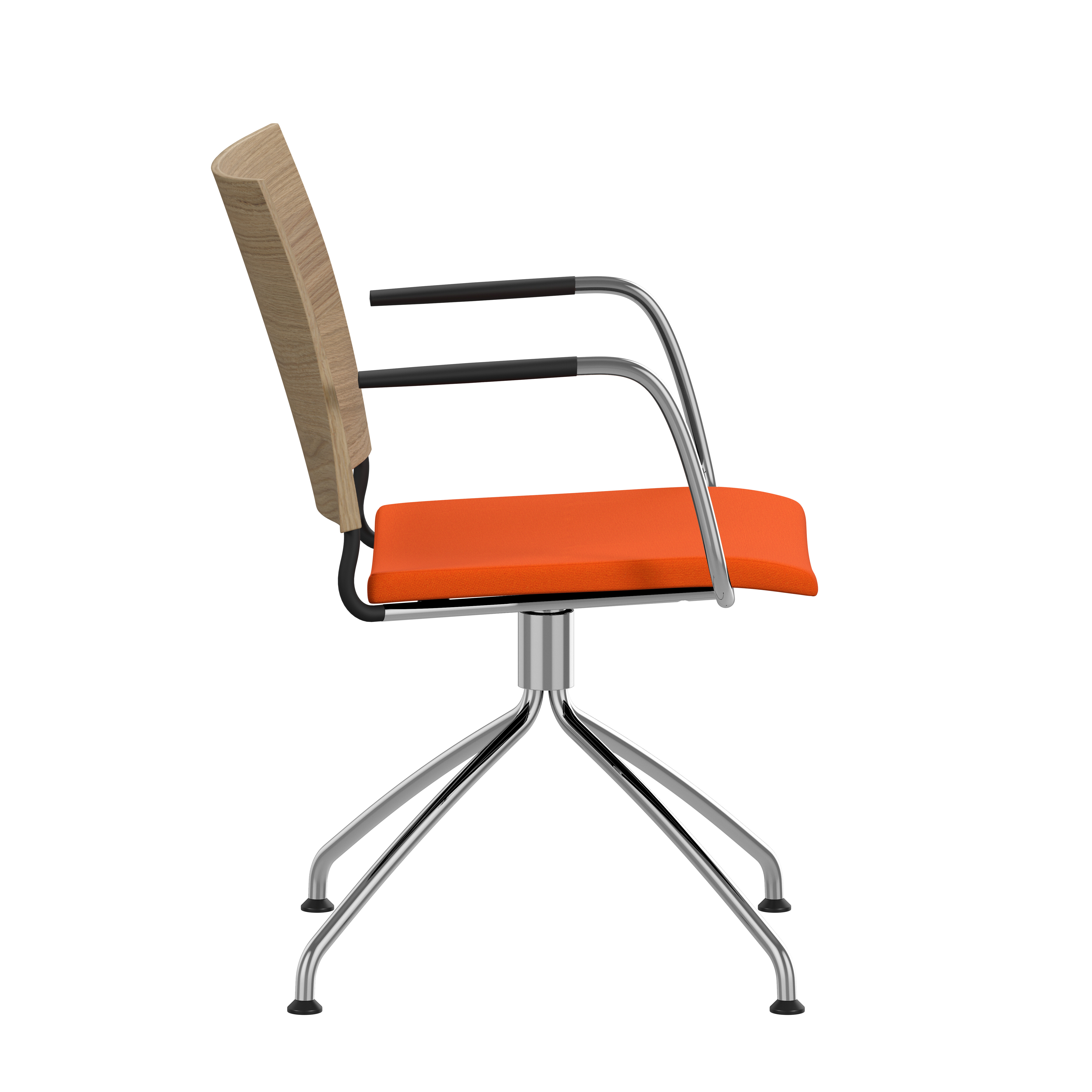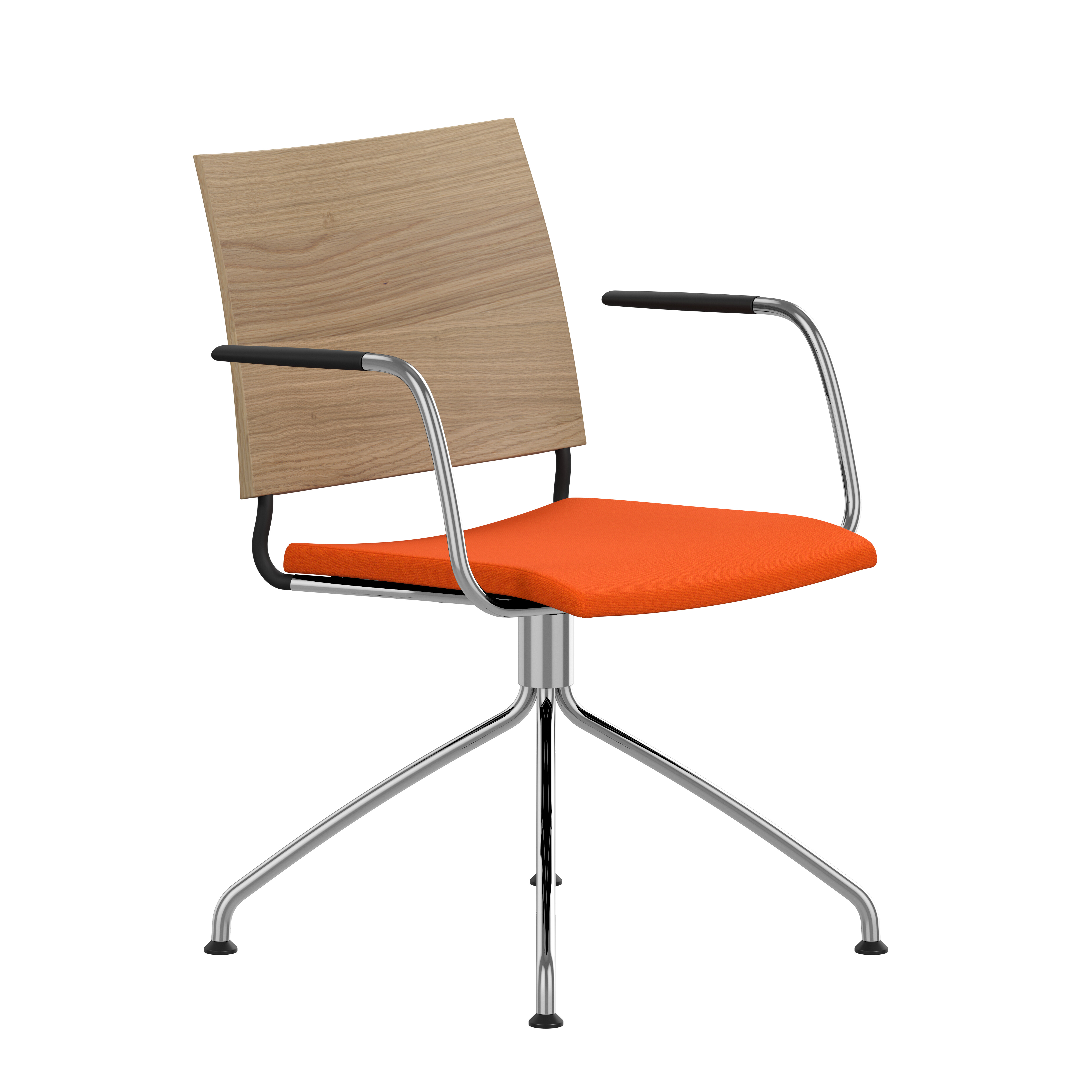 Frame of Ø18 mm powder coated or chromium plated steel tubing. Upholstered seat with high resilient polyurethane foam incl. stacking protection or seat of black cast polyurethane. Upholstered back, black cast polyurethane back or back of natural ash, birch or oak. Alt. stained birch as standard, stained ash on request. Spring steel in back. Armrests in dark or light woodfibre. Note! Armrest contains 40% woodfibre, therefore look may vary.