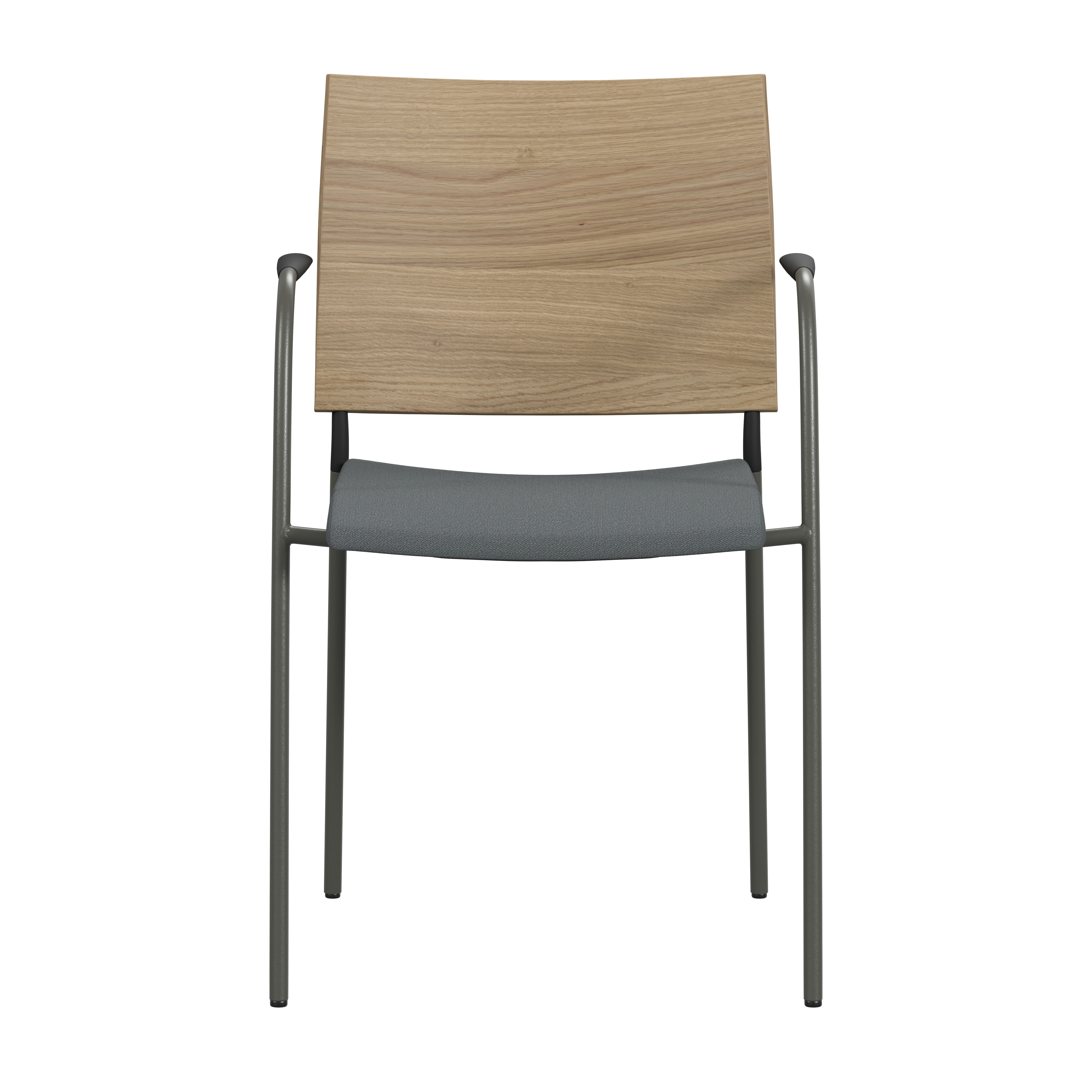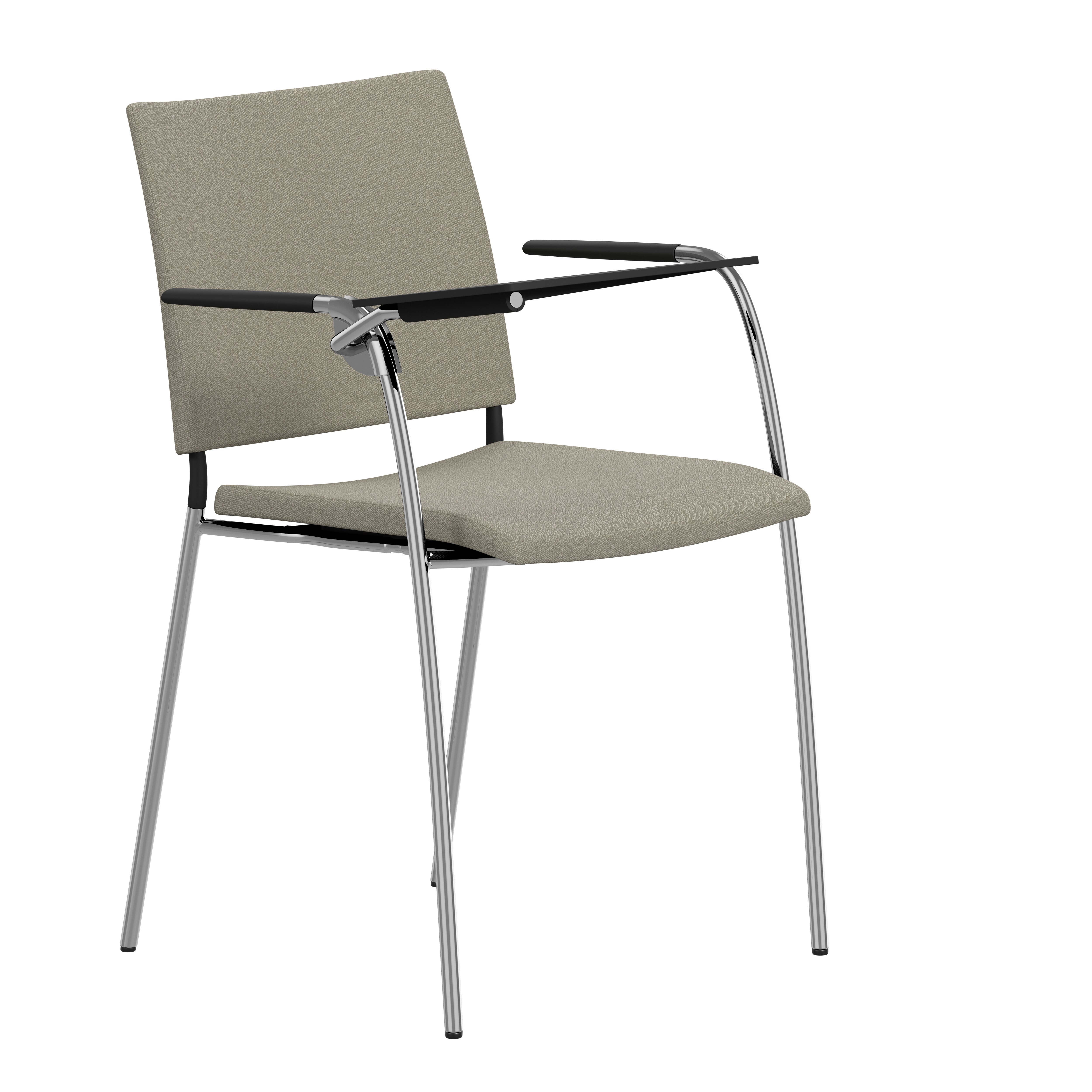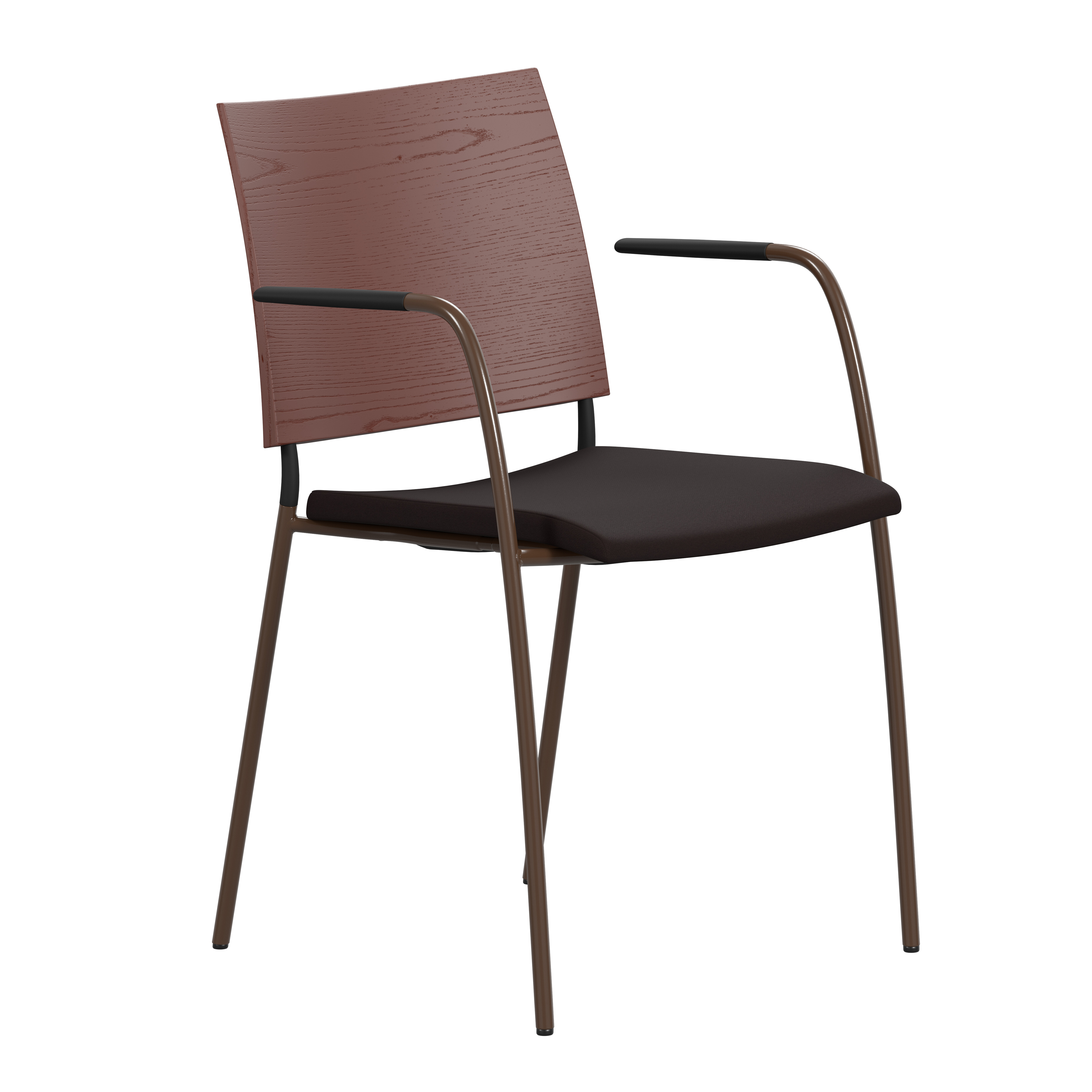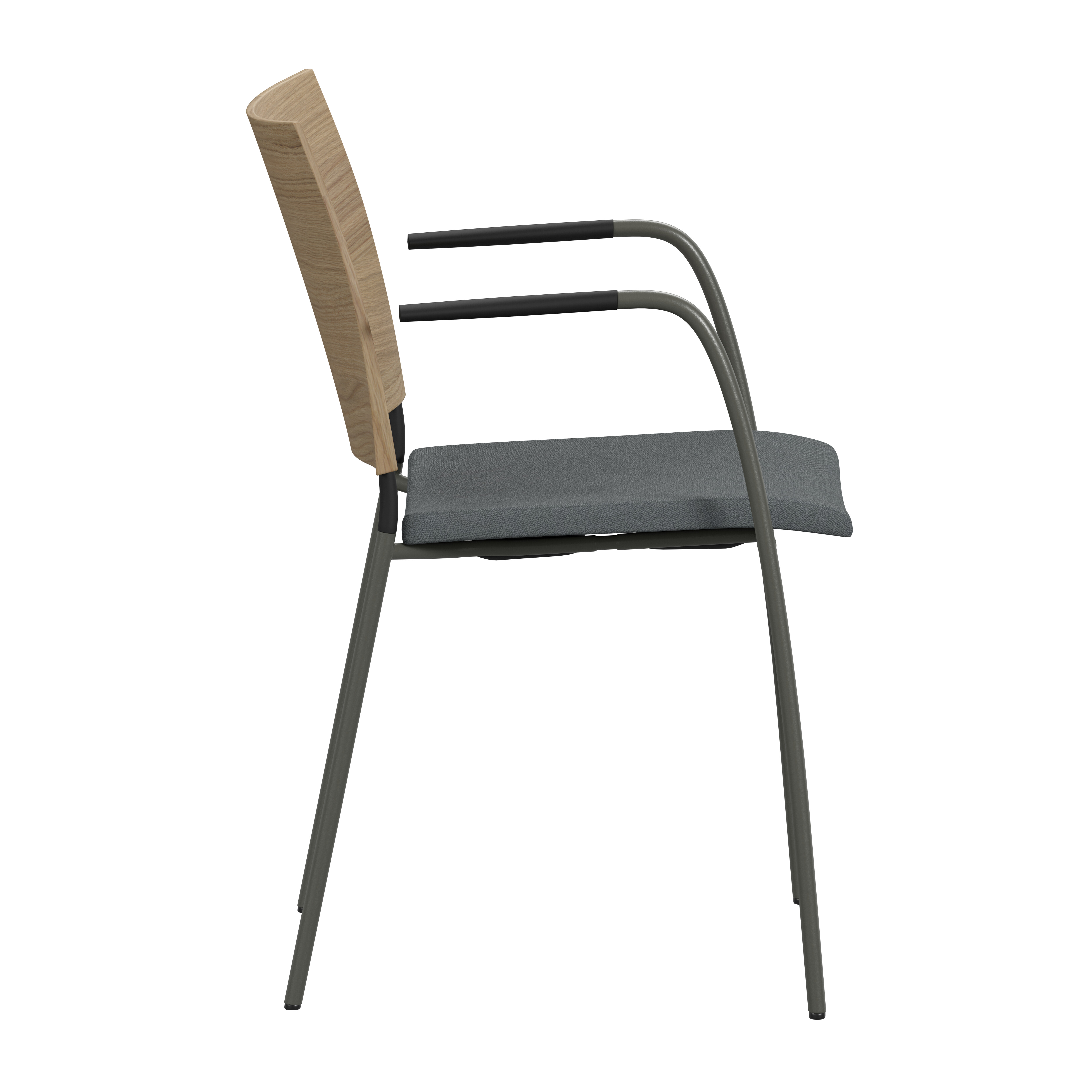 Upholstered seat with high resilient polyurethane foam incl. stacking protection. Upholstered back or back of natural ash, birch or oak. Alt. stained birch as standard, stained ash on request. Back in black polyurethane on request. Armrests in dark or light woodfibre. Note! Armrest contains 40% woodfibre, therefore look may vary.