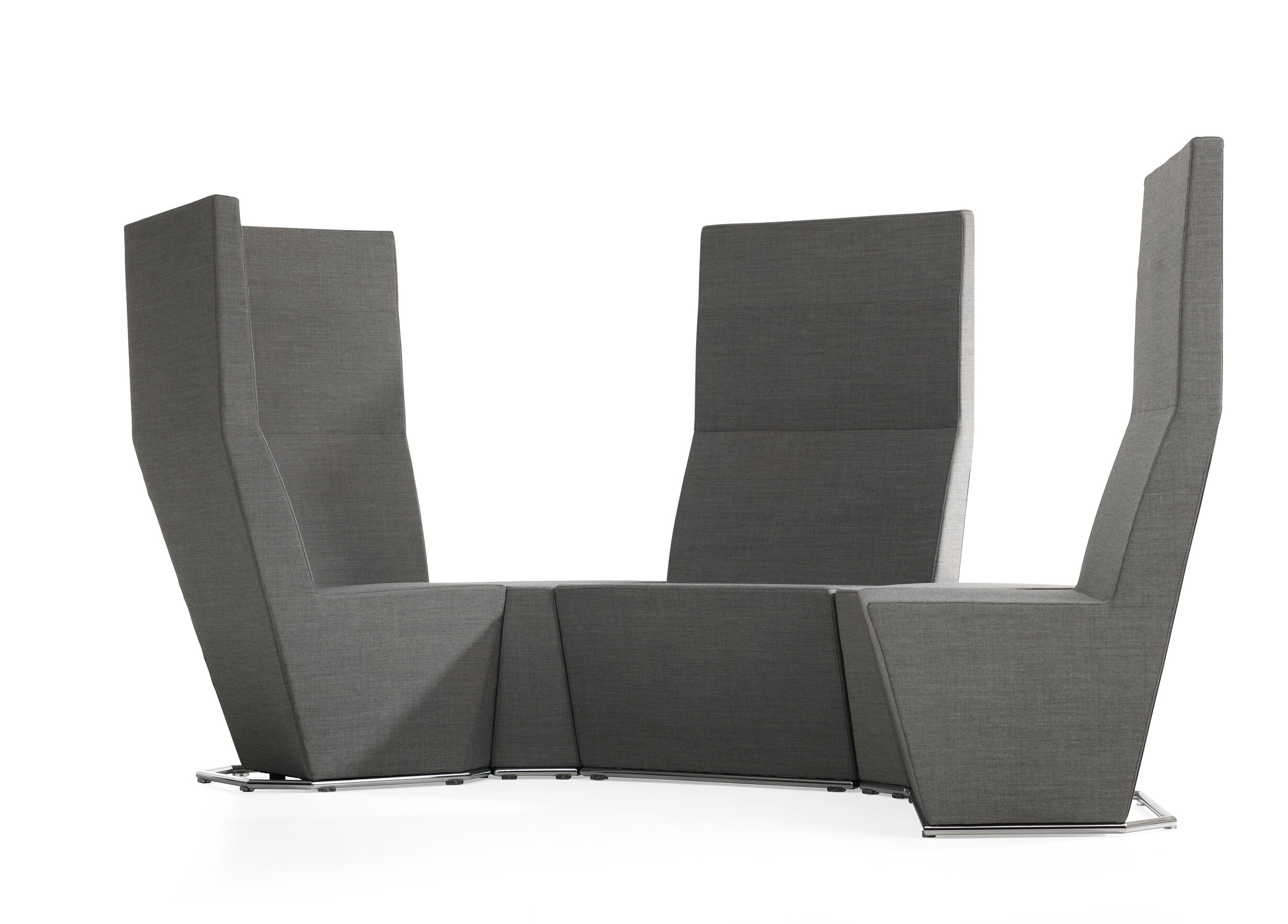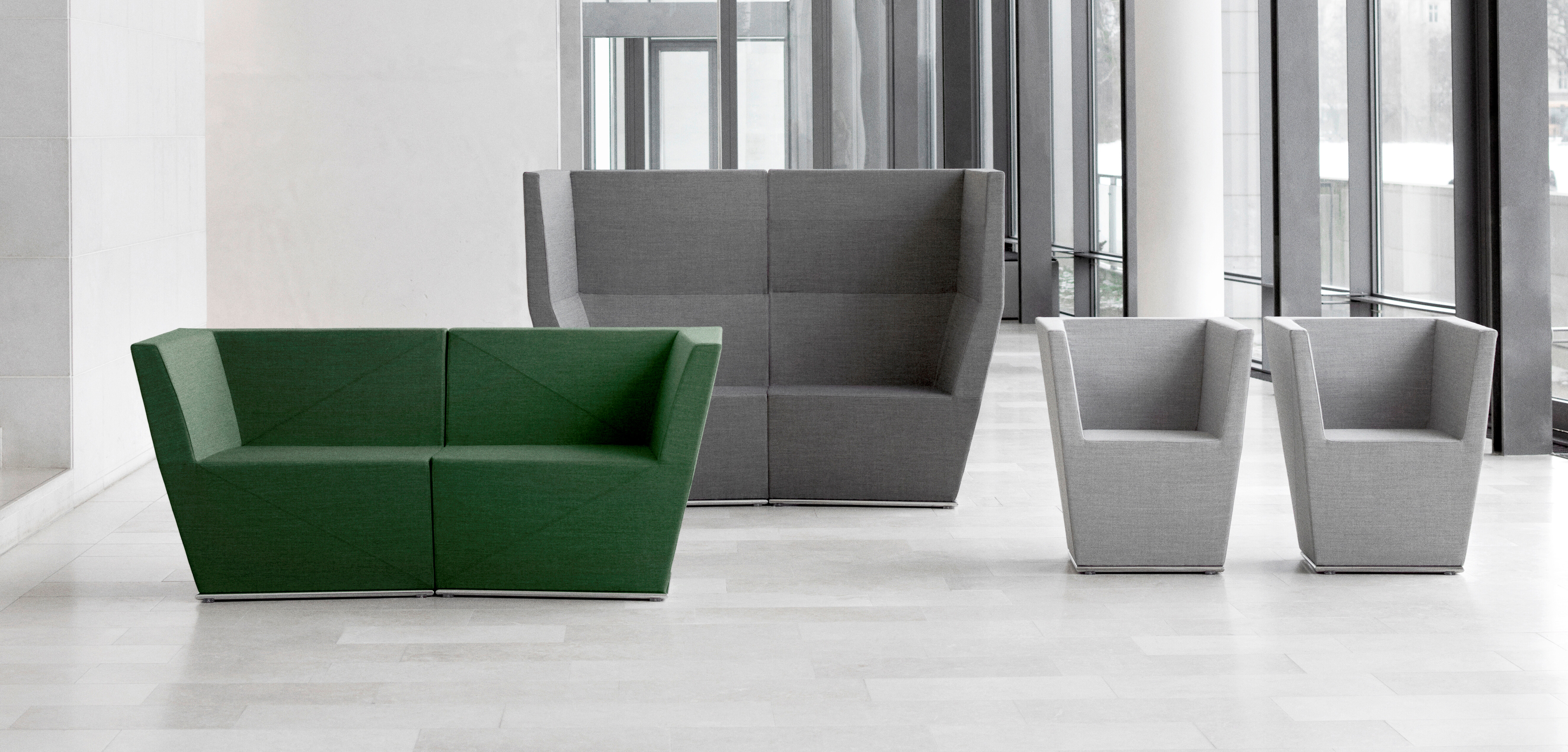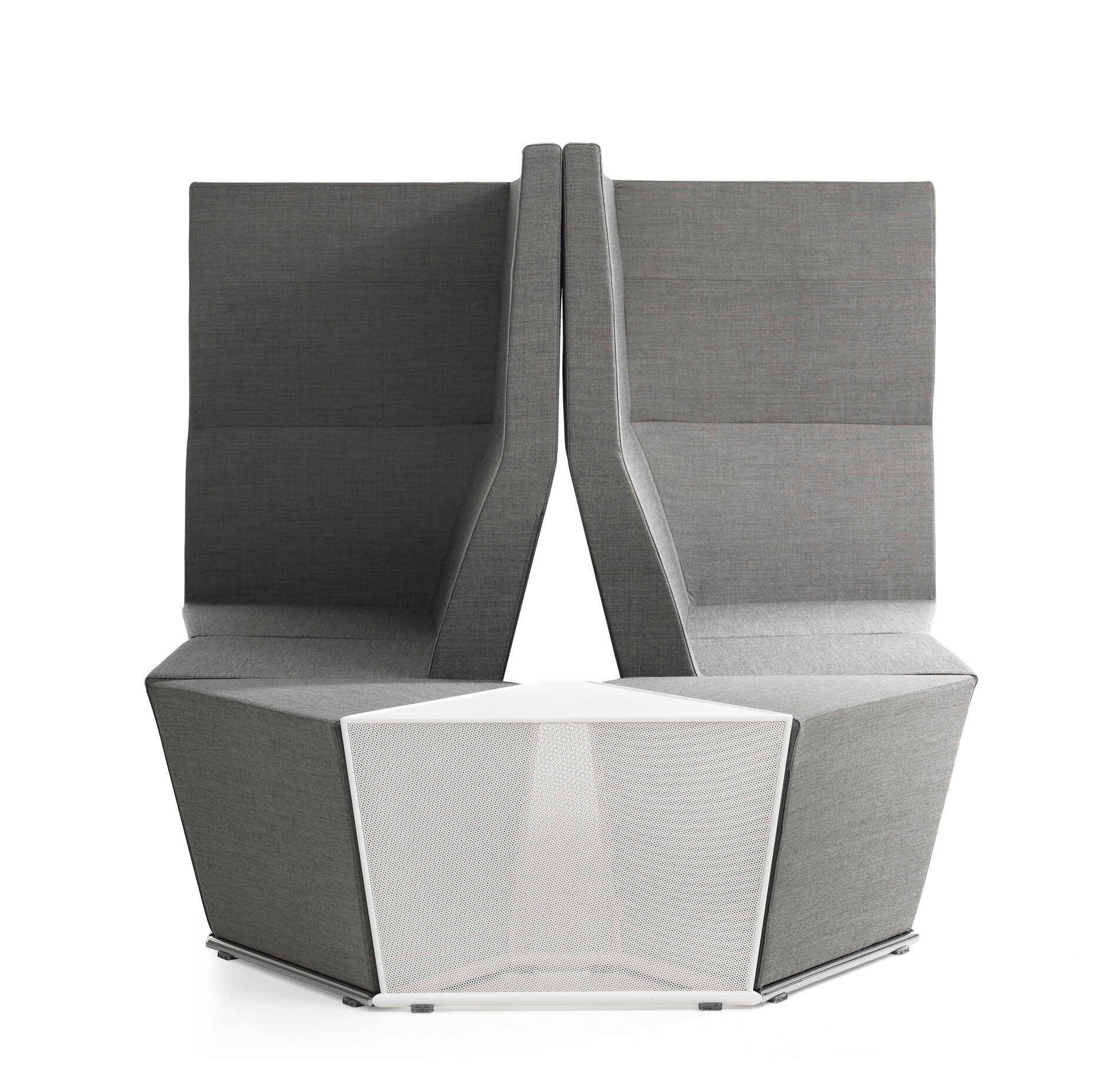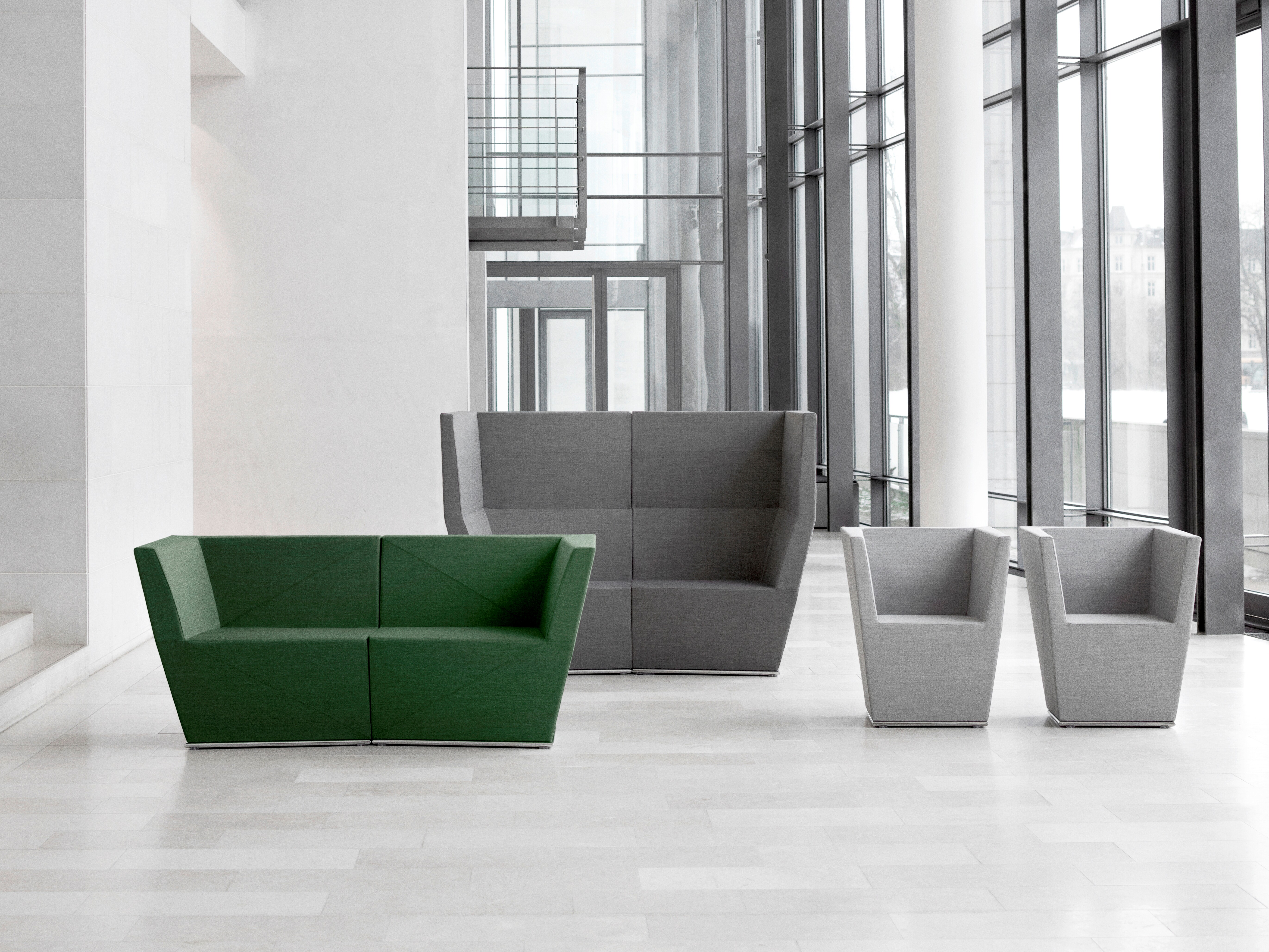 This modular seating series with its six different modular units inspires to creative and flexible seating solutions. Use them separately or in groups to create exiting configurations. Two-, three- or even more seater sofas are easily created. The innovative linking device, Quicklink, consisting of built-in magnets makes the units easy to regroup. The airy table in perforated sheet metal makes a perfect complement to the upholstered units. The high back version offers a feeling of seclusion in open areas and enables building a soft, sophisticated room within the room.